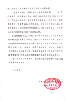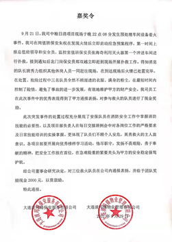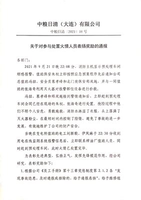 來(lái)自中糧日清(大連)有限公司的通報(bào)表?yè)P(yáng)信